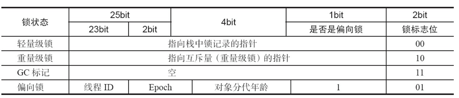 | 锁状态 | 25bit | 4bit | 1bit是否是偏向锁 | 2bit 锁标志位 |
